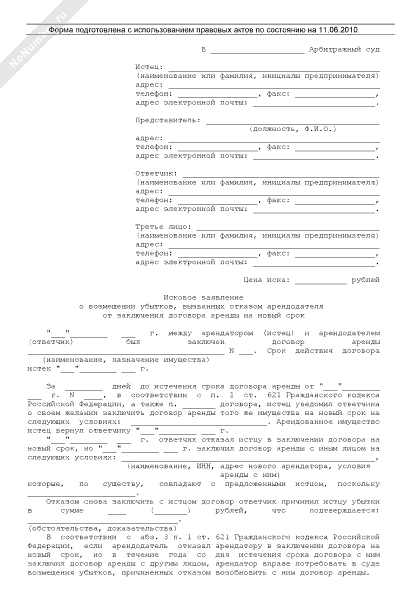 - 1200Исковое заявление арендатора в арбитражный суд о возмещении убытков, вызванных отказом арендодателя от заключения договора аренды на новый срок