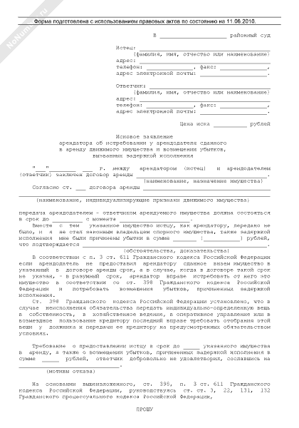 - 1185Исковое заявление арендатора в суд общей юрисдикции об истребовании у арендодателя сданного в аренду движимого имущества и возмещении убытков, вызванных задержкой исполнения