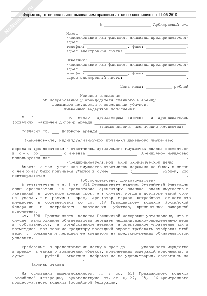 - 1188Исковое заявление арендатора в арбитражный суд об истребовании у арендодателя сданного в аренду движимого имущества и возмещении убытков, вызванных задержкой исполнения
