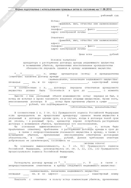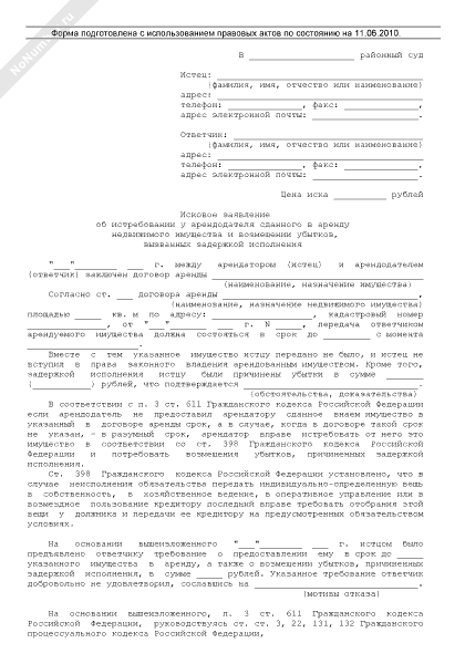- 1190Исковое заявление арендатора в суд общей юрисдикции об истребовании у арендодателя сданного в аренду недвижимого имущества и возмещении убытков, вызванных задержкой исполнения