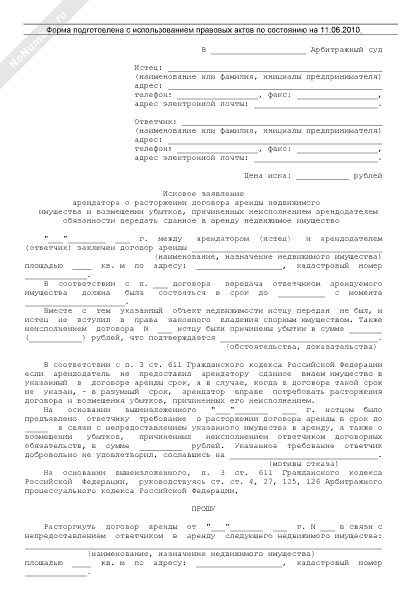 - 1194Исковое заявление арендатора в арбитражный суд об истребовании у арендодателя сданного в аренду недвижимого имущества и возмещении убытков, вызванных задержкой исполнения
