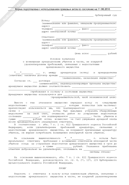 - 1187Исковое заявление арендатора в арбитражный суд о возмещении арендодателем убытков в части, не покрытой удовлетворением требований, связанных с недостатками арендованного имущества