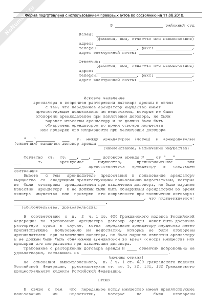 - 1196Исковое заявление арендатора в суд общей юрисдикции о досрочном расторжении договора аренды в связи с тем, что переданное арендатору имущество имеет препятствующие пользованию им недостатки, которые не были оговорены арендодателем при заключении договора, не были заранее известны арендатору и не должны были быть обнаружены арендатором во время осмотра имущества или проверки его исправности при заключении договора
