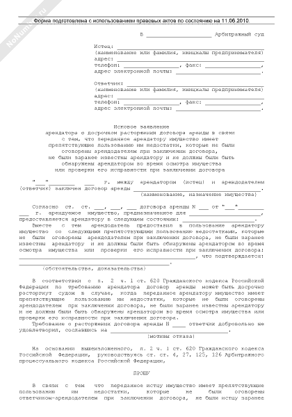 - 1197Исковое заявление арендатора в арбитражный суд о досрочном расторжении договора аренды в связи с тем, что переданное арендатору имущество имеет препятствующие пользованию им недостатки, которые не были оговорены арендодателем при заключении договора, не были заранее известны арендатору и не должны были быть обнаружены арендатором во время осмотра имущества или проверки его исправности при заключении договора