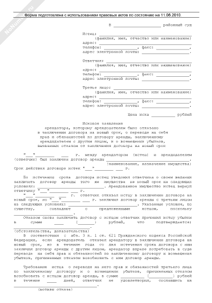 - 1198Исковое заявление арендатора, которому арендодателем было отказано в заключении договора на новый срок, в суд общей юрисдикции о переводе на себя прав и обязанностей по договору аренды, заключенному арендодателем с другим лицом, и о возмещении убытков, вызванных отказом от заключения договора на новый срок