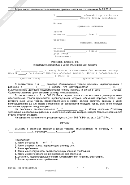 - 1181Исковое заявление в суд общей юрисдикции о возмещении разницы в ценах обмениваемых товаров