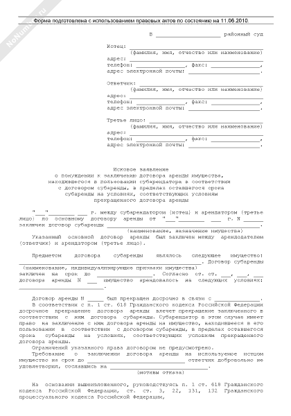 - 1193Исковое заявление субарендатора в арбитражный суд о понуждении к заключению с ним договора аренды имущества, находившегося в его пользовании в соответствии с договором субаренды, в пределах оставшегося срока субаренды на условиях, соответствующих условиям прекращенного договора аренды