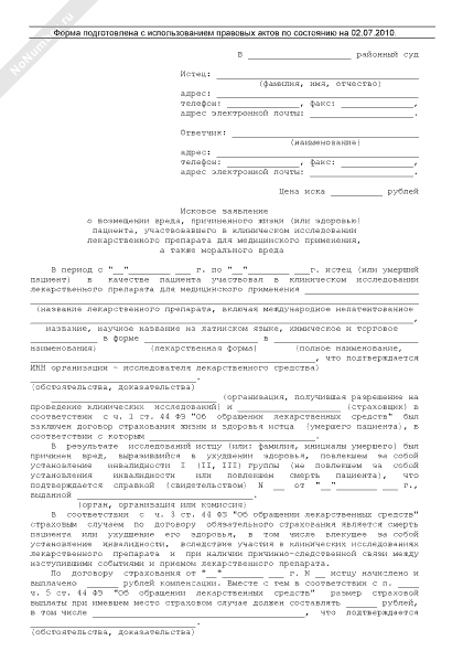 - 1298Исковое заявление о возмещении вреда, причиненного жизни или здоровью пациента, участвовавшего в клиническом исследовании лекарственного препарата для медицинского применения, а также морального вреда