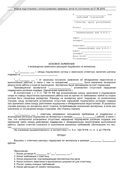 - 1285Исковое заявление подрядчика в суд общей юрисдикции о возмещении заказчиком расходов подрядчика на экспертизу в случае, когда экспертизой установлено отсутствие нарушений подрядчиком договора подряда или причинной связи между действиями подрядчика и обнаруженными недостатками выполненной работы