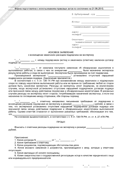 - 1286Исковое заявление подрядчика в арбитражный суд о возмещении заказчиком расходов подрядчика на экспертизу в случае, когда экспертизой установлено отсутствие нарушений подрядчиком договора подряда или причинной связи между действиями подрядчика и обнаруженными недостатками выполненной работы
