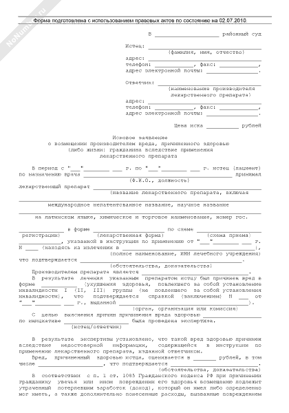 - 1300Исковое заявление о возмещении производителем вреда, причиненного здоровью гражданина вследствие применения лекарственных препаратов