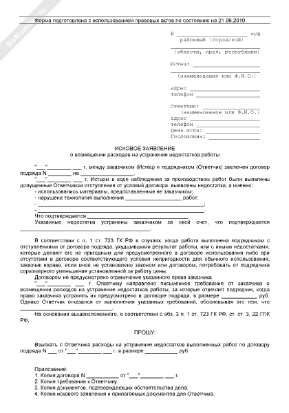 - 1291Исковое заявление заказчика в арбитражный суд о возмещении своих расходов на устранение недостатков работы, за которые отвечает подрядчик, когда право заказчика устранять их предусмотрено в договоре подряда