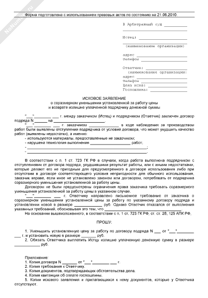 - 1289Исковое заявление заказчика в арбитражный суд о соразмерном уменьшении установленной за работу цены и возврате излишне уплаченной подрядчику денежной суммы в связи с обнаружением недостатков, за которые отвечает подрядчик