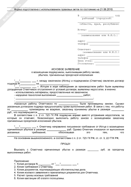 - 1292Исковое заявление заказчика в суд общей юрисдикции о возмещении подрядчиком, выполнившим работу заново, убытков, причиненных просрочкой исполнения