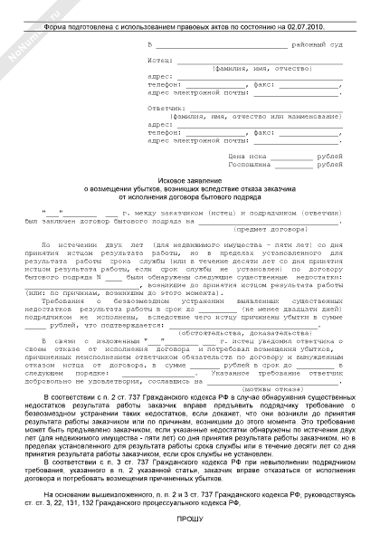 - 1295Исковое заявление заказчика в арбитражный суд о возмещении убытков, причиненных отказом от исполнения договора в связи с тем, что отступления в работе от условий договора подряда или иные недостатки результата работы в установленный заказчиком разумный срок не были устранены либо являются существенными и неустранимыми