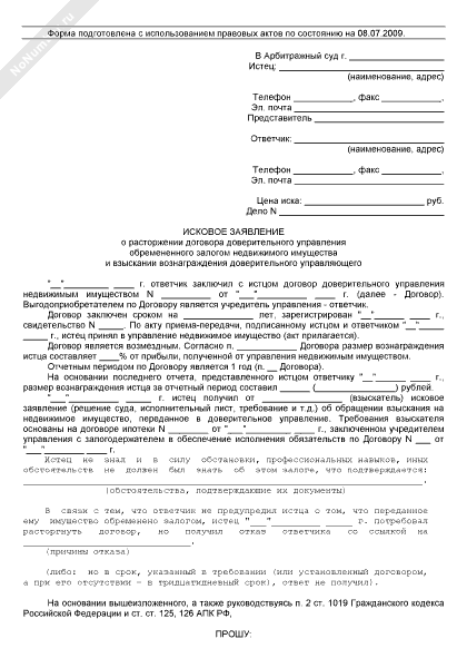 - 138Исковое заявление о расторжении договора доверительного управления обремененного залогом недвижимого имущества и взыскании вознаграждения доверительного управляющего