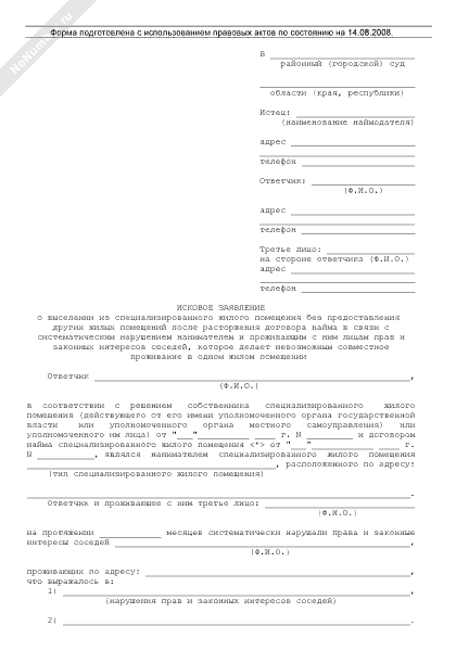 - 129Исковое заявление о выселении из специализированного жилого помещения без предоставления других жилых помещений после расторжения договора найма в связи с систематическим нарушением нанимателем и проживающим с ним лицам прав и законных интересов соседей, которое делает невозможным совместное проживание в одном жилом помещении
