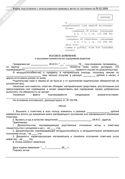 - 136Исковое заявление о взыскании алиментов на содержание родителя