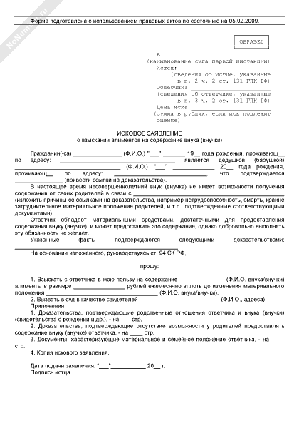 - 135Исковое заявление о взыскании алиментов на содержание внука (внучки)