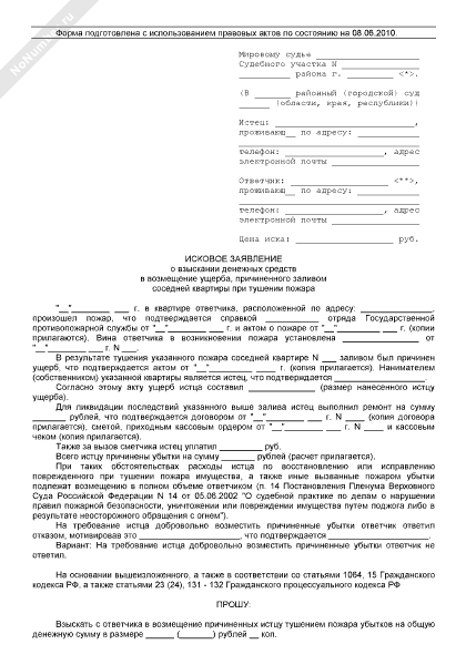 - 122Исковое заявление в суд общей юрисдикции о взыскании денежных средств в возмещение ущерба, причиненного заливом соседней квартиры при тушении пожара