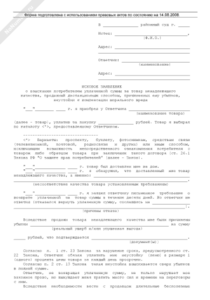 - 126Исковое заявление о взыскании потребителем уплаченной суммы за товар ненадлежащего качества, проданный дистанционным способом, причиненных ему убытков, неустойки и компенсации морального вреда