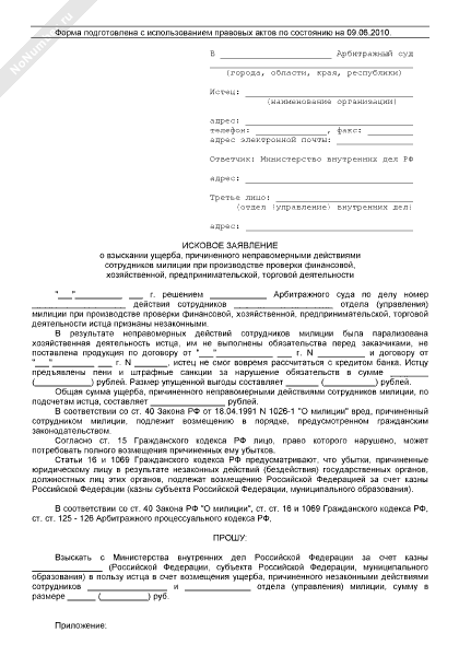 - 130Исковое заявление в арбитражный суд о взыскании ущерба, причиненного неправомерными действиями сотрудников милиции при производстве проверки финансовой, хозяйственной, предпринимательской, торговой деятельности