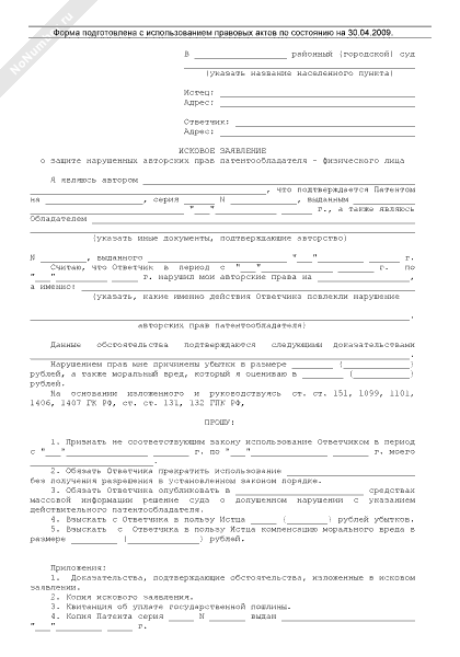 - 128Исковое заявление о защите нарушенных авторских прав патентообладателя — физического лица