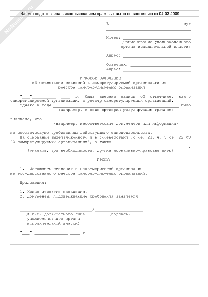 - 125Исковое заявление об исключении сведений о саморегулируемой организации из реестра саморегулируемых организаций