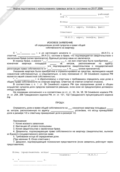 - 139Исковое заявление в суд общей юрисдикции об определении долей супругов в праве общей собственности на квартиру
