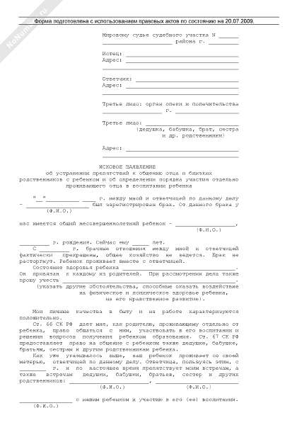 - 123Исковое заявление об устранении препятствий к общению отца и близких родственников с ребенком и определении порядка участия отдельно проживающего отца в воспитании ребенка