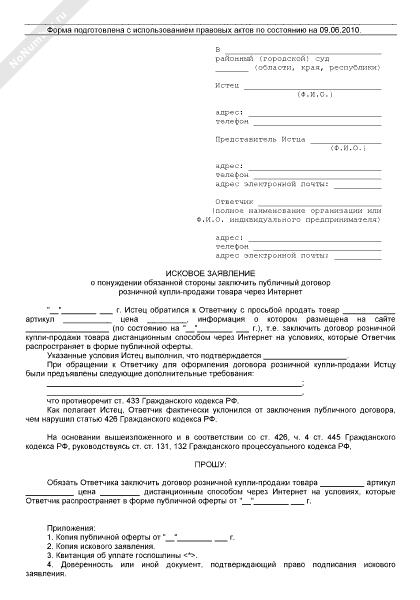 - 124Исковое заявление в суд общей юрисдикции о понуждении продавца заключить публичный договор розничной купли-продажи товара через Интернет
