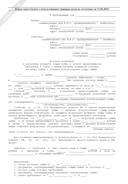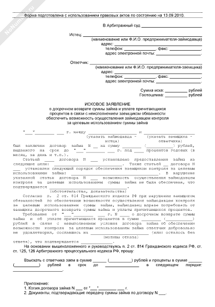- 1401Исковое заявление в арбитражный суд о досрочном возврате суммы займа и уплате причитающихся процентов в связи с неисполнением заемщиком обязанности обеспечить возможность осуществления займодавцем контроля за целевым использованием суммы займа
