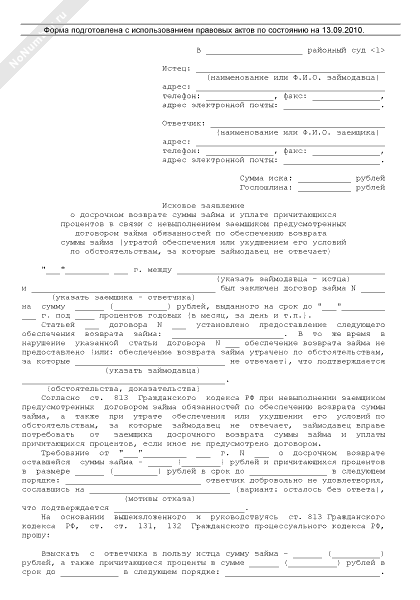 - 1413Исковое заявление в суд общей юрисдикции о досрочном возврате суммы займа и уплате причитающихся процентов в связи с невыполнением заемщиком предусмотренных договором займа обязанностей по обеспечению возврата суммы займа (утратой обеспечения или ухудшением его условий по обстоятельствам, за которые займодавец не отвечает)
