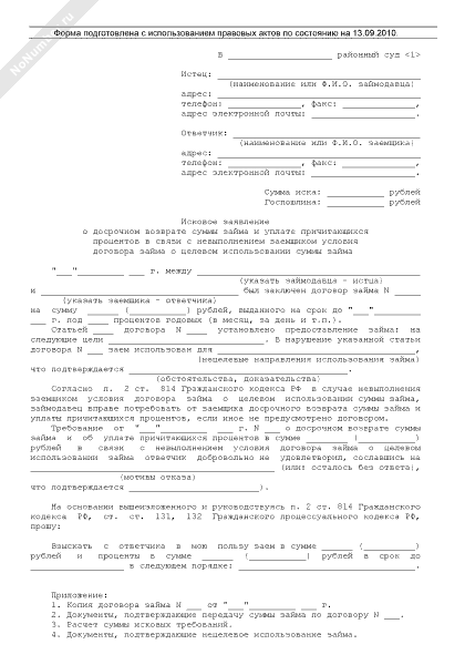 - 1414Исковое заявление в суд общей юрисдикции о досрочном возврате суммы займа и уплате причитающихся процентов в связи с невыполнением заемщиком условия договора займа о целевом использовании суммы займа