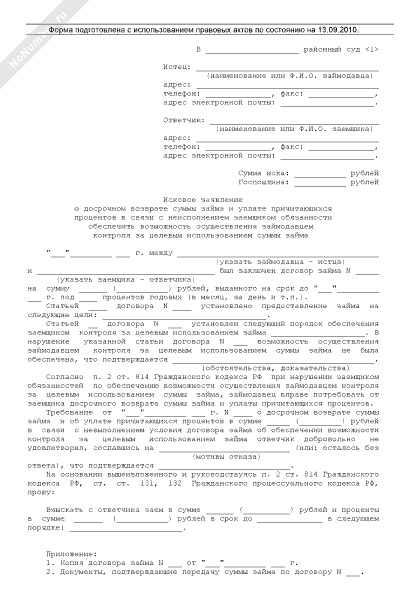 - 1416Исковое заявление в суд общей юрисдикции о досрочном возврате суммы займа и уплате причитающихся процентов в связи с неисполнением заемщиком обязанности обеспечить возможность осуществления займодавцем контроля за целевым использованием суммы займа