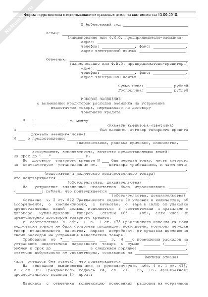 - 1405Исковое заявление в арбитражный суд о возмещении кредитором расходов заемщика на устранение недостатков товара, переданного по договору товарного кредита