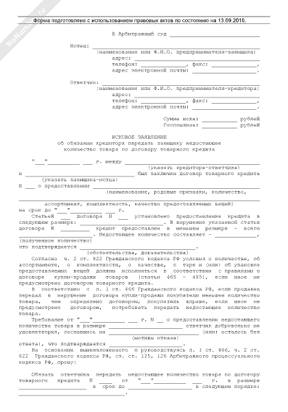 - 1402Исковое заявление в арбитражный суд об обязании кредитора передать заемщику недостающее количество товара по договору товарного кредита