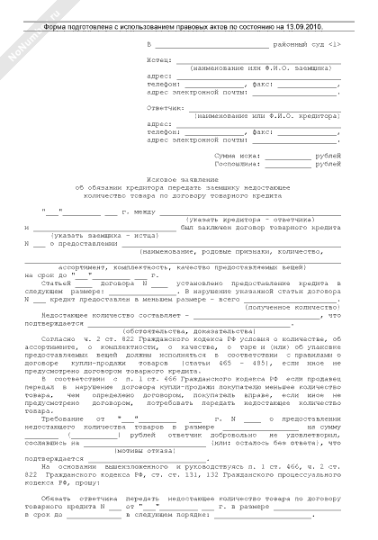 - 1417Исковое заявление в суд общей юрисдикции об обязании кредитора передать заемщику недостающее количество товара по договору товарного кредита