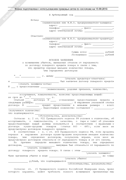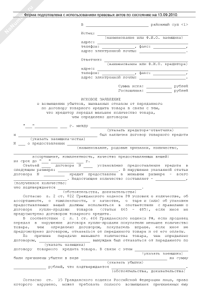 - 1403Исковое заявление заемщика в суд общей юрисдикции о возмещении убытков, вызванных отказом от переданного по договору товарного кредита товара в связи с тем, что кредитор передал меньшее количество товара, чем определено договором
