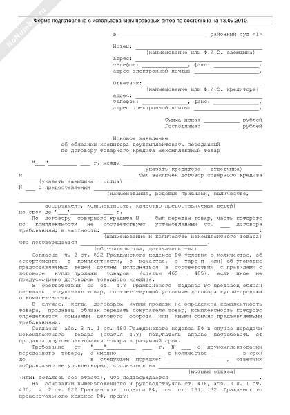 - 1419Исковое заявление заемщика в суд общей юрисдикции об обязании кредитора доукомплектовать переданный по договору товарного кредита некомплектный товар