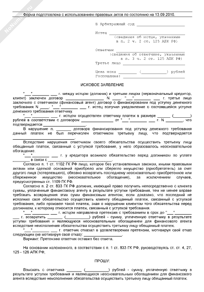 - 1436Исковое заявление должника в арбитражный суд о взыскании неосновательного обогащения в виде сумм, уплаченных финансовому агенту в результате уступки денежного требования, в связи с тем, что он не исполнил свое обязательство осуществить клиенту обещанный платеж, связанный с уступкой требования