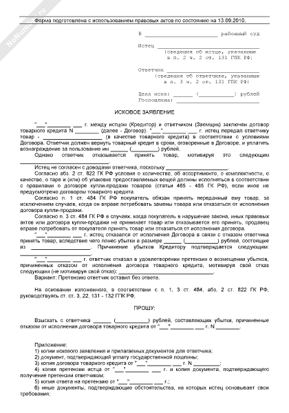 - 1430Исковое заявление кредитора в суд общей юрисдикции об обязании заемщика принять товар, переданный по договору товарного кредита