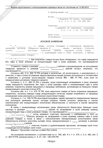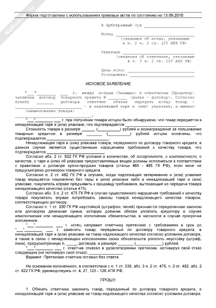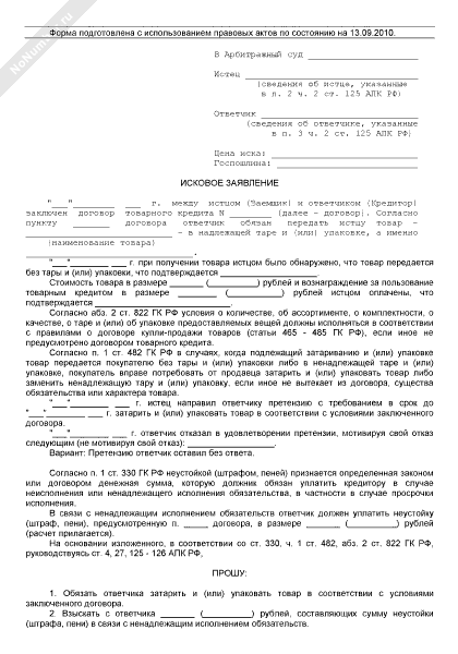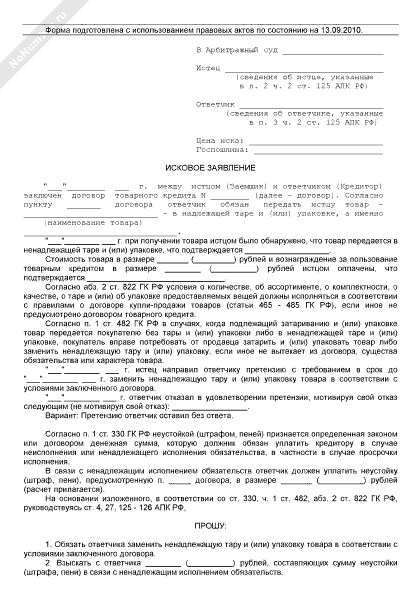 - 1425Исковое заявление заемщика в арбитражный суд об обязании кредитора заменить тару и (или) упаковку товара, переданного по договору товарного кредита, в ненадлежащей таре и (или) упаковке