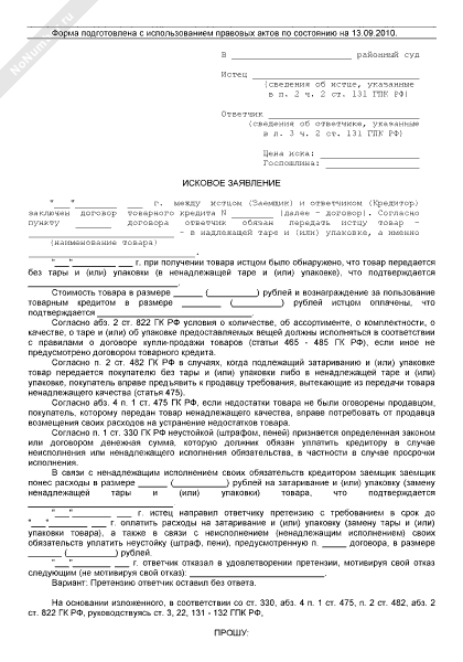 - 1424Исковое заявление заемщика в суд общей юрисдикции об обязании кредитора заменить тару и (или) упаковку товара, переданного по договору товарного кредита, в ненадлежащей таре и (или) упаковке