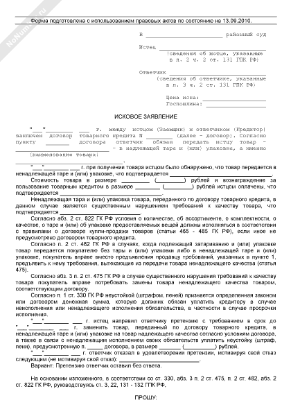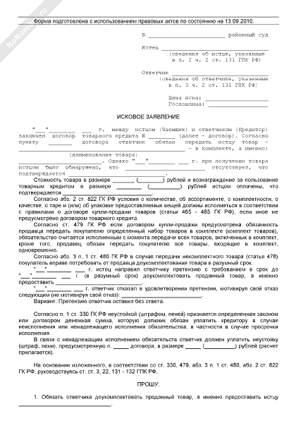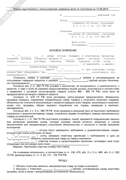 - 1440Исковое заявление заемщика в суд общей юрисдикции об обязании кредитора заменить переданный по договору товарного кредита некомплектный товар на товар в комплекте