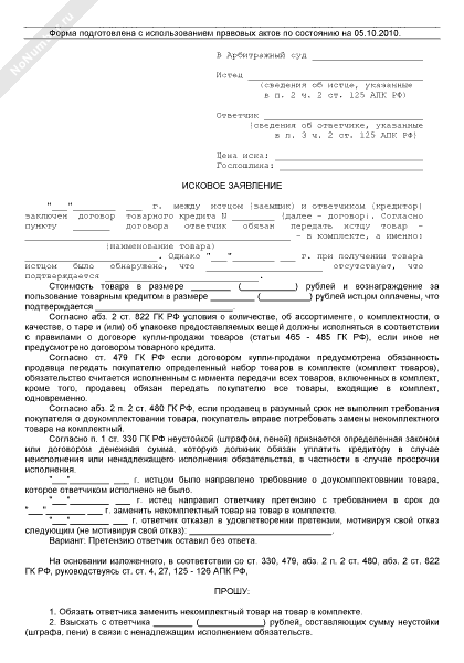 - 1438Исковое заявление заемщика в арбитражный суд об обязании кредитора доукомплектовать товар, переданный в нарушение договора товарного кредита не в комплекте