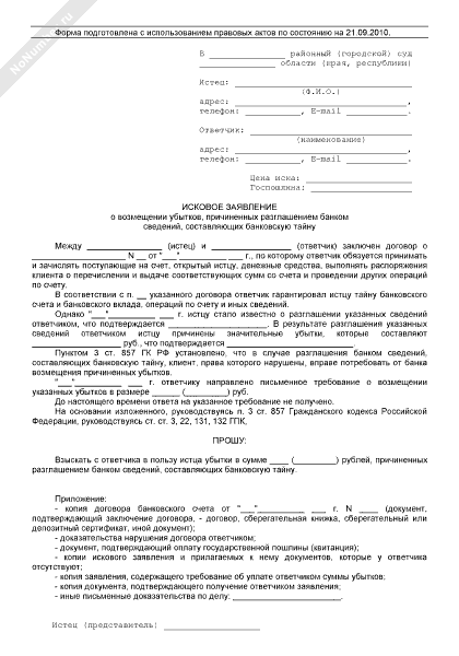 - 1460Исковое заявление в арбитражный суд о возмещении убытков, причиненных разглашением банком сведений, составляющих банковскую тайну