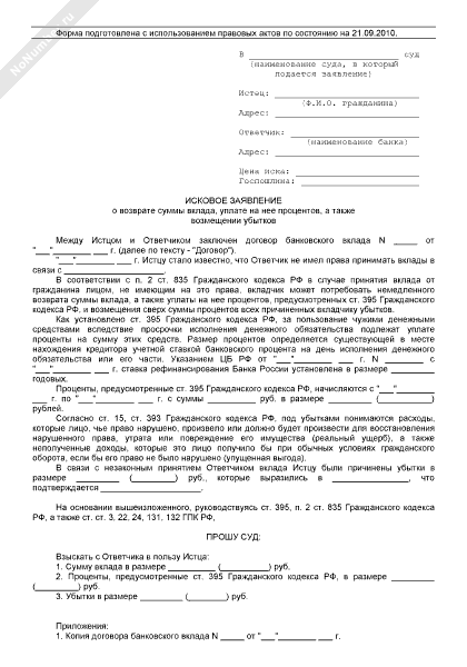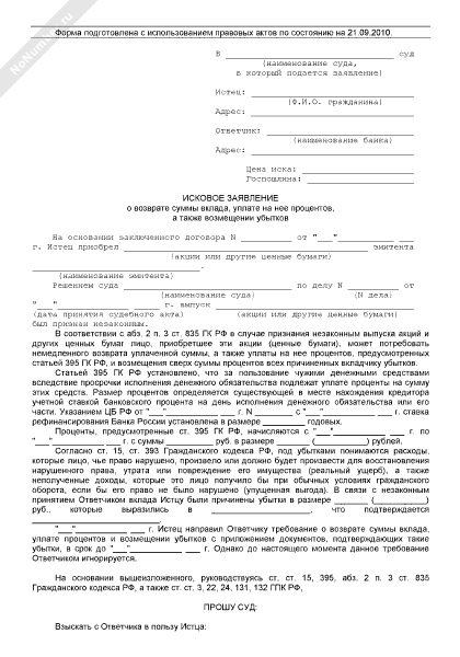 - 1445Исковое заявление в суд общей юрисдикции о возврате суммы вклада, уплате на нее процентов, а также возмещении убытков, причиненных вследствие привлечения денежных средств гражданина во вклады под векселя или иные ценные бумаги, исключающие получение их держателем вклада по первому требованию и осуществление вкладчиком других прав, предусмотренных законодательством