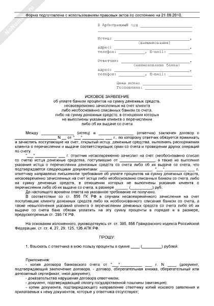 - 1458Исковое заявление в арбитражный суд об уплате банком процентов на сумму денежных средств, несвоевременно зачисленных на счет клиента либо необоснованно списанных банком со счета, либо на сумму денежных средств, в отношении которых не выполнены указания клиента о перечислении либо об их выдаче со счета