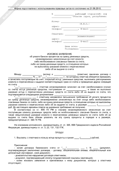 - 1457Исковое заявление в суд общей юрисдикции об уплате банком процентов на сумму денежных средств, несвоевременно зачисленных на счет клиента либо необоснованно списанных банком со счета, либо на сумму денежных средств, в отношении которых не выполнены указания клиента о перечислении либо об их выдаче со счета